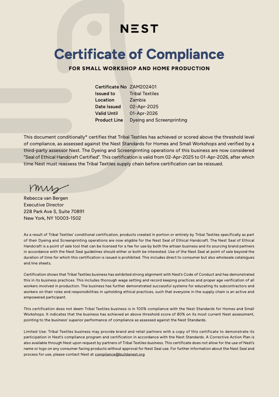 We are proudly certified through Nest’s Ethical Handcraft program.